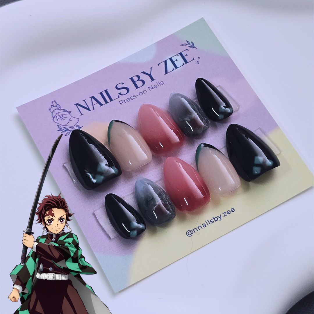 Tanjiro-inspired glossy press-on nails with ombre, nude & dark glam details. Everyday wearable anime nail art.