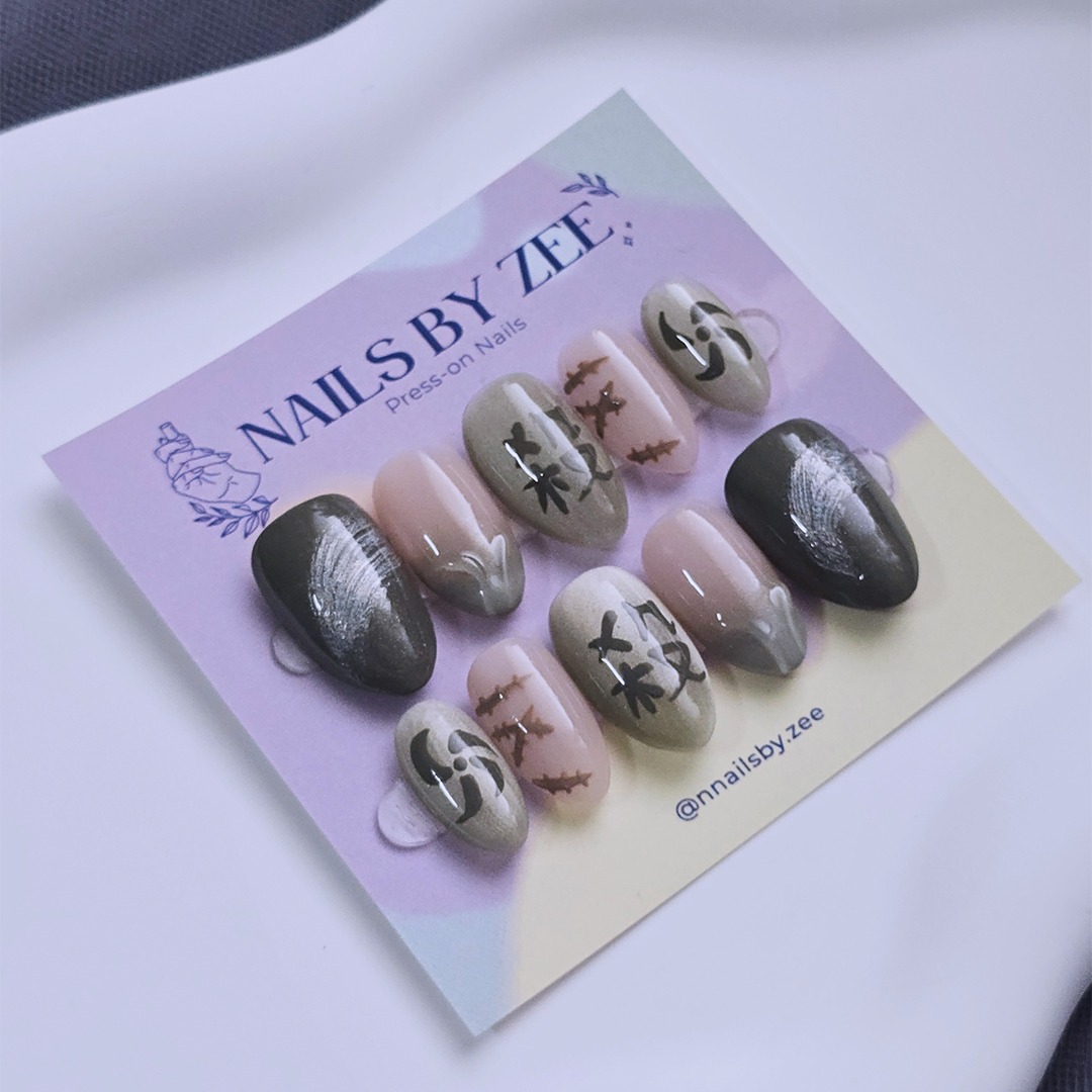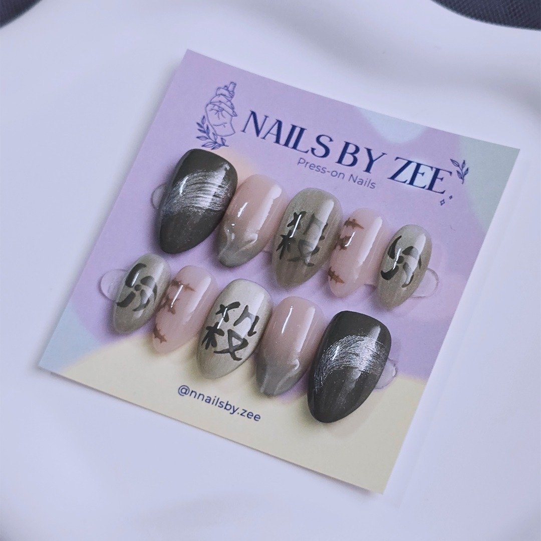 Grey and nude ombre press-on nails with bold brush art. Glossy nail set perfect for autumn, night out, or everyday wear.