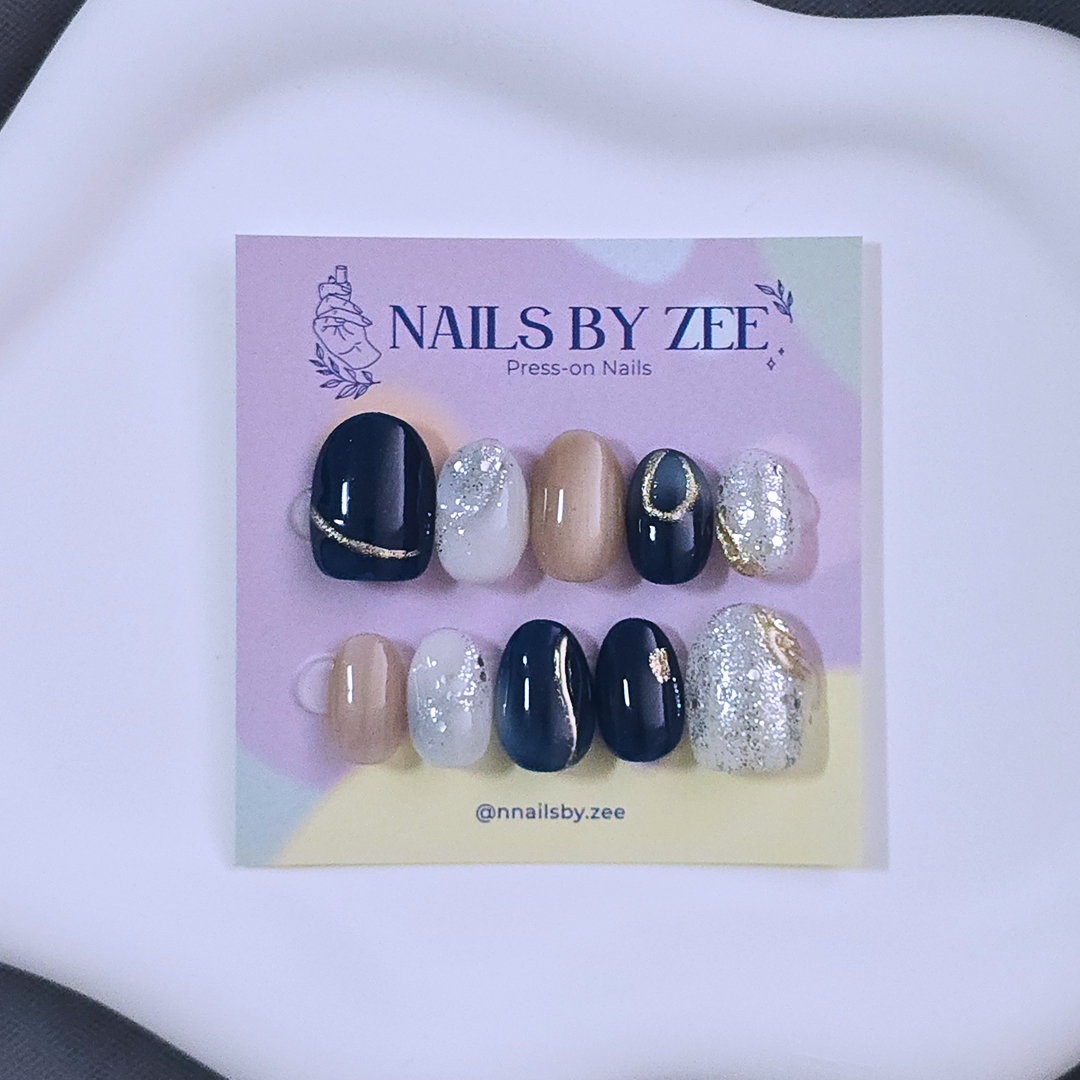 Deep navy, soft nude, and champagne glitter—your shortcut to an effortlessly polished, luxuriously glam look.