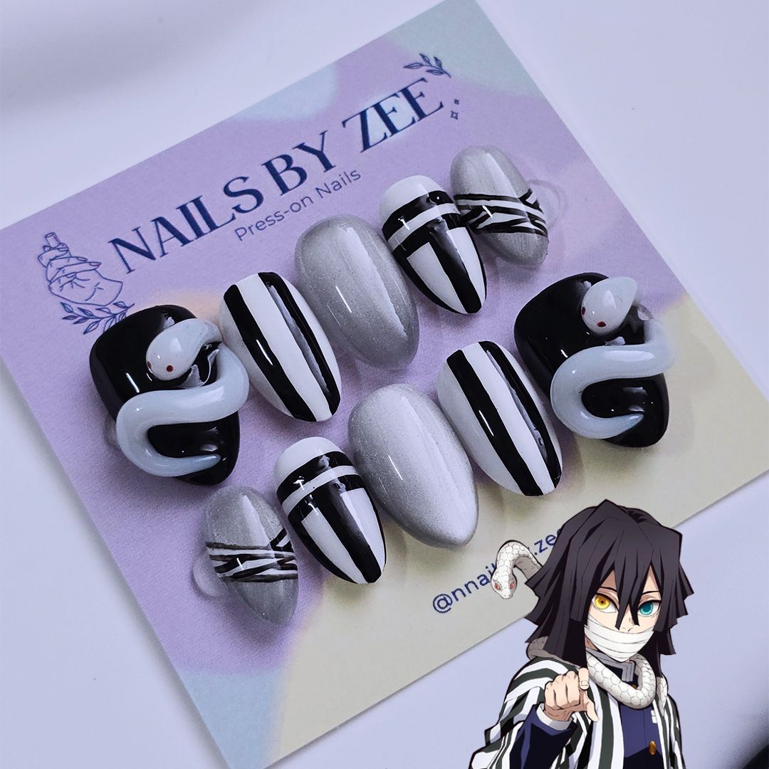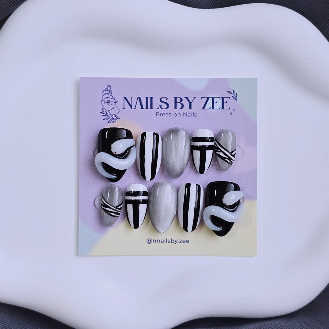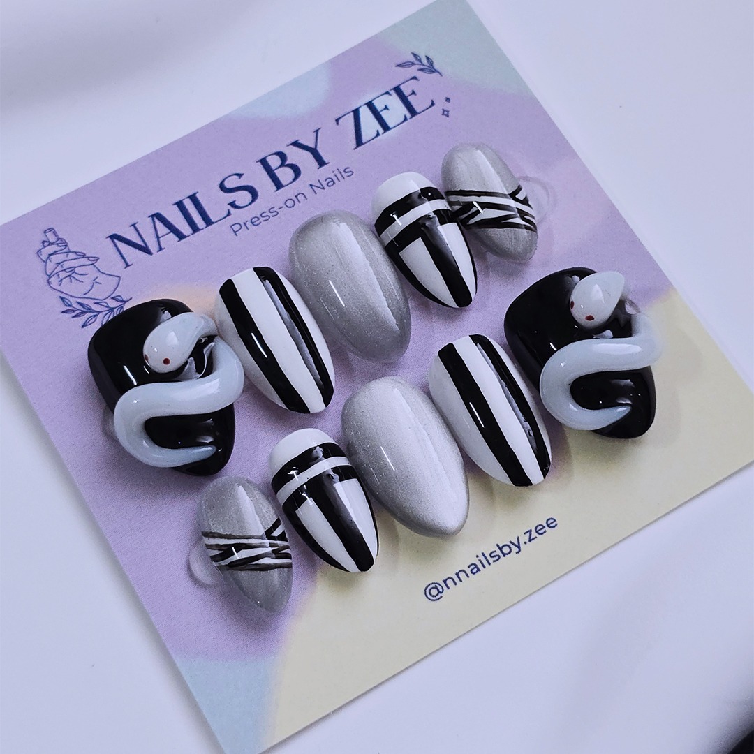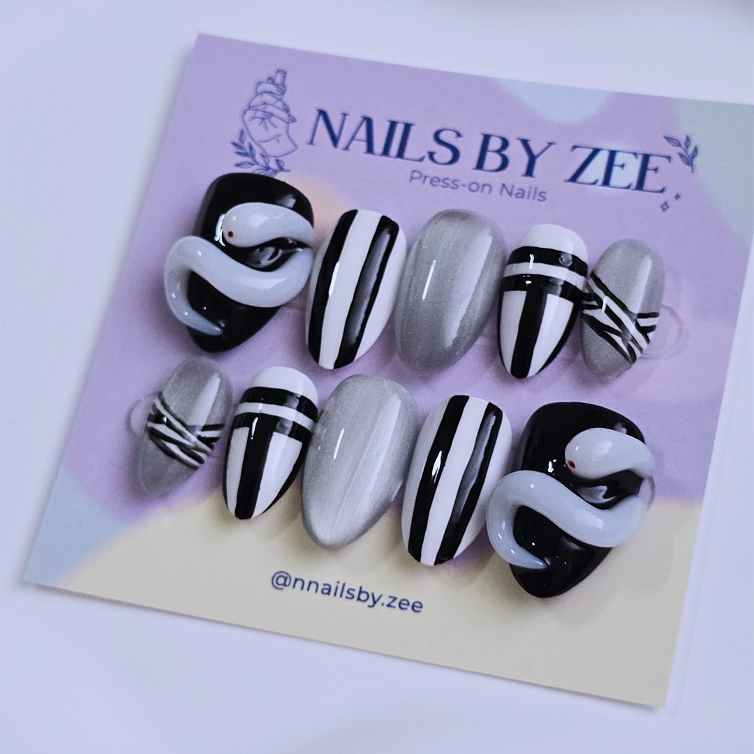 Black and white striped press-on nails with glossy finish and 3D snake detail. Bold, stylish nails for day or night.