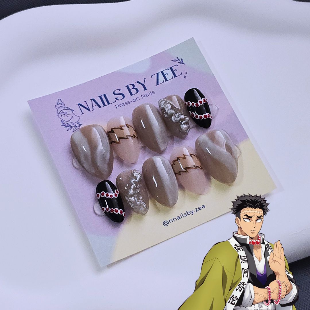 Glossy grey marble press-on nails with 3D accents & bead details. Work-friendly nail art meets anime-inspired elegance.