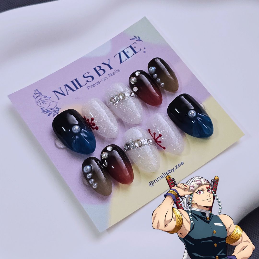 Glitter press-on nails with ombre shades, pearl gems & shimmer accents. Everyday elegance meets anime-inspired glam.