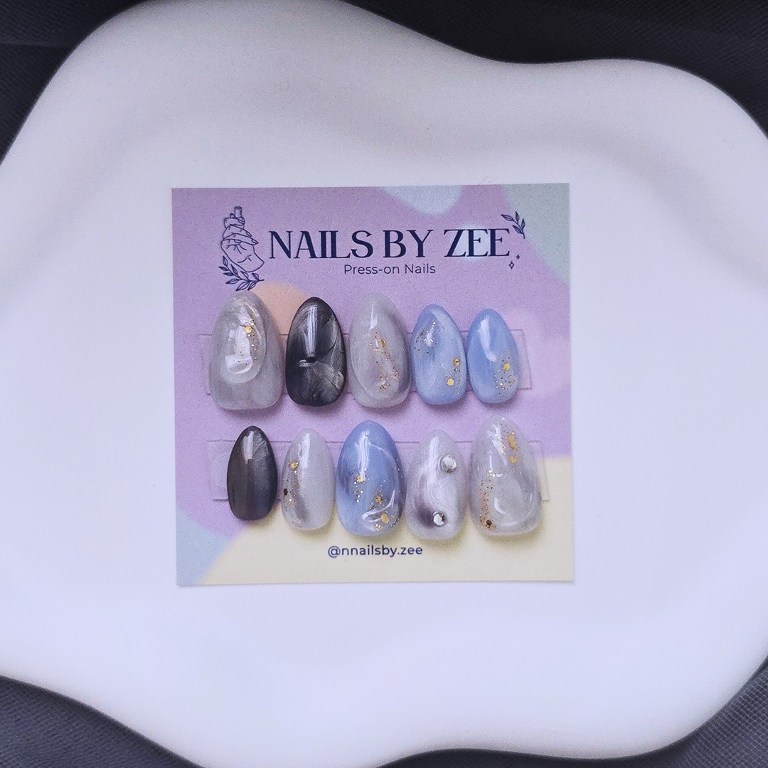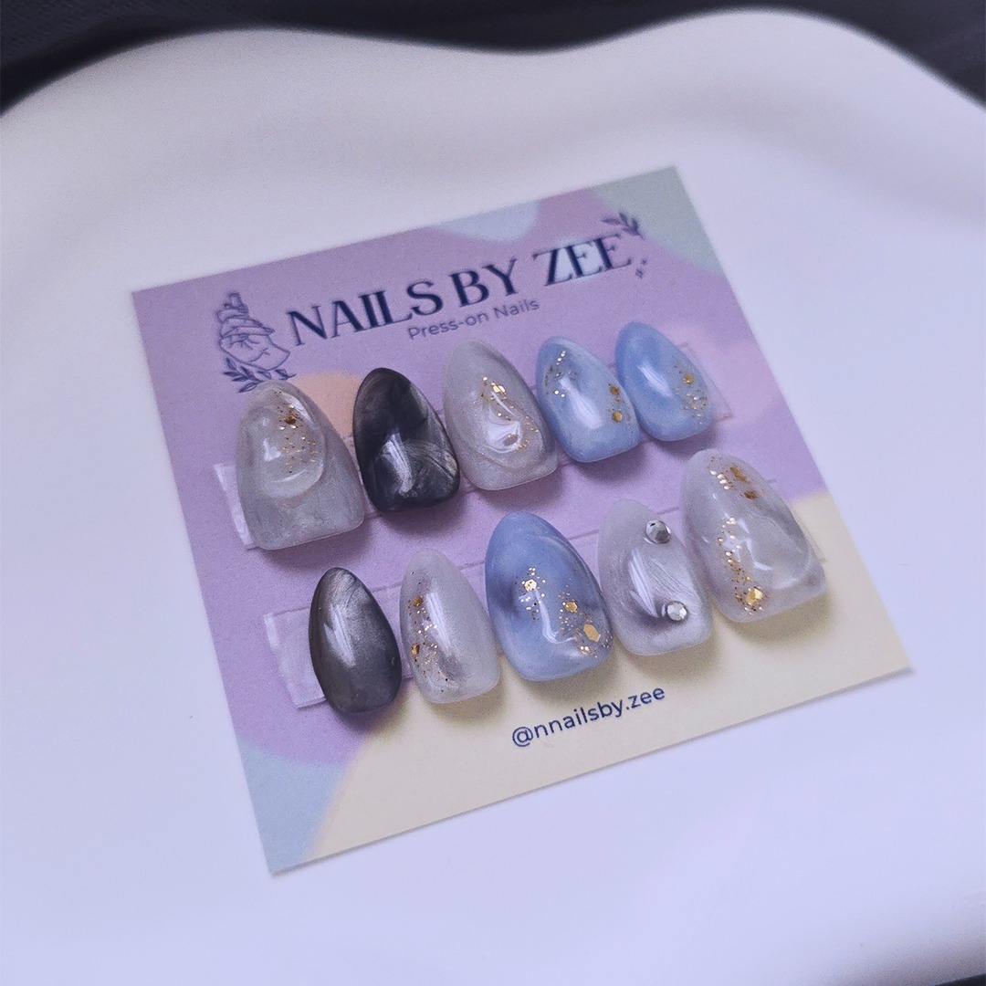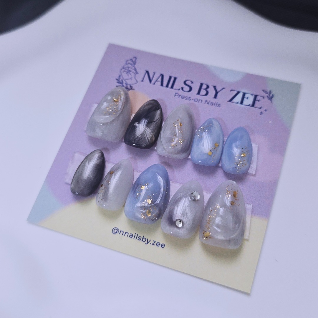 Moody greys, soft blues, and gold foil details—this set looks like a storm you actually want to be caught in.