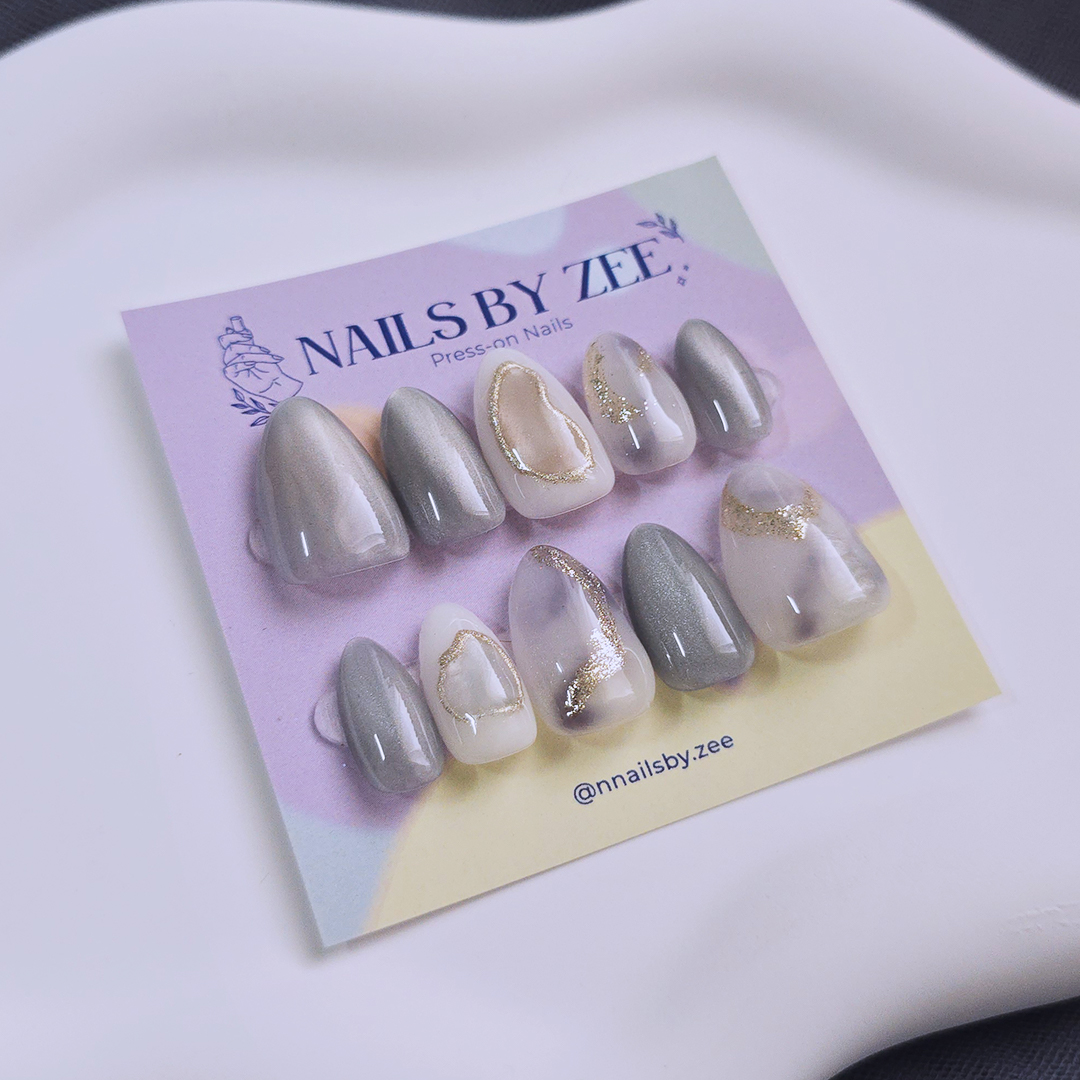 Grey chrome meets gold foil in a set that’s cool, collected, and quietly confident—like you on a good day.